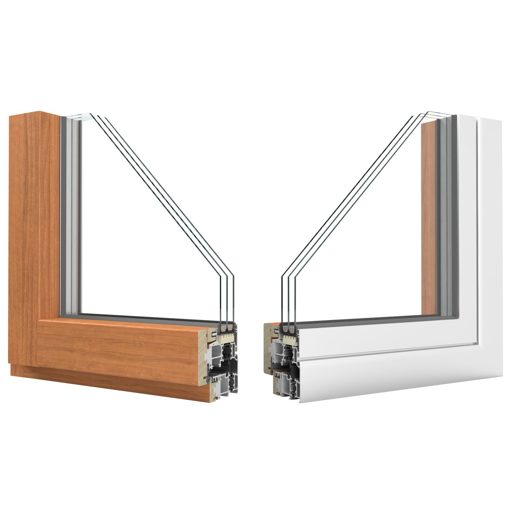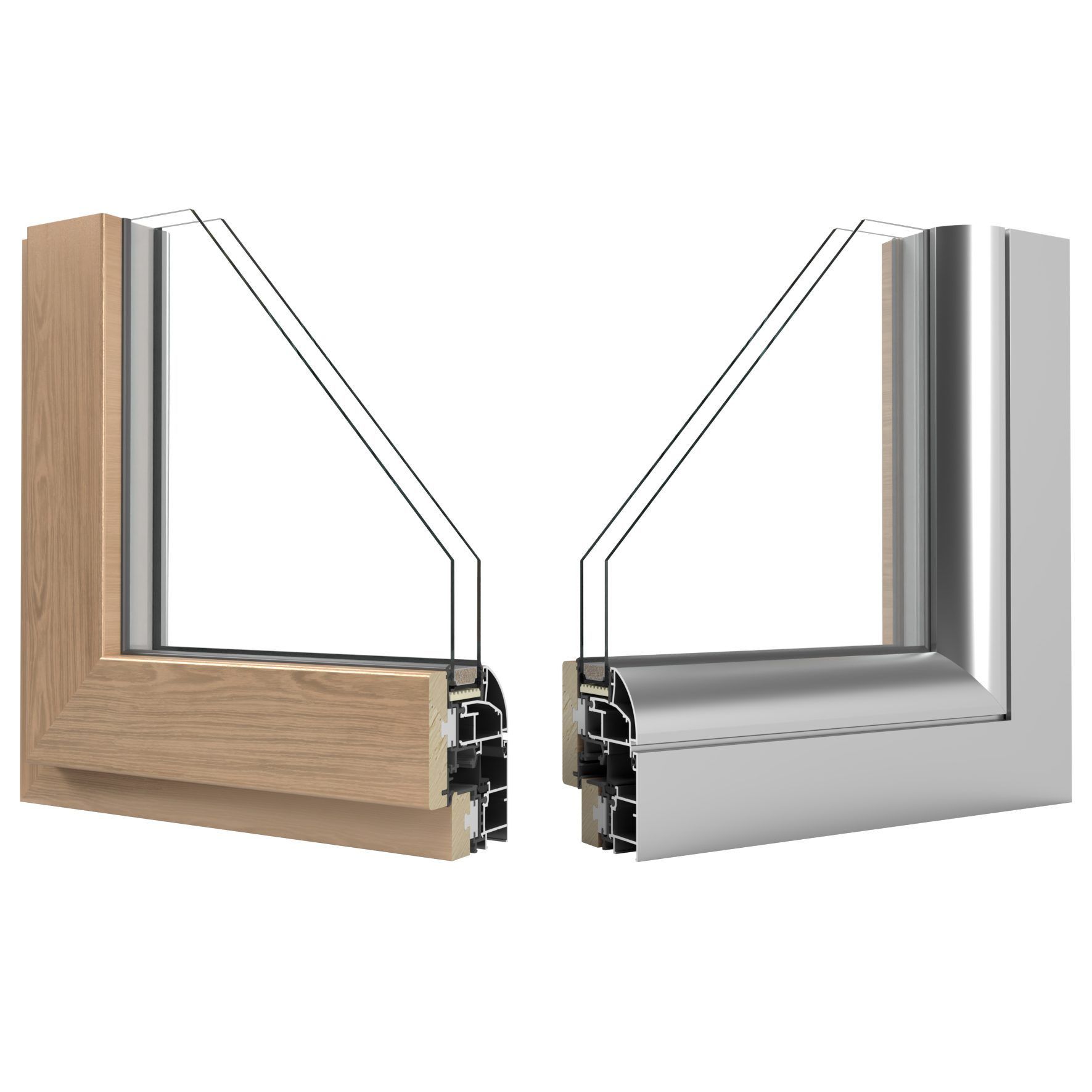 Sistema per finestre e porte finestre con struttura portante in alluminio con aggiunta del legno come rivestimento interno che richiama la semplicità di questo materiale.